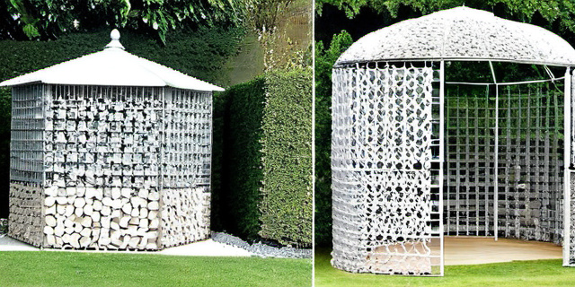 Габионные беседки состоят из металлических корзин, заполненных декоративным камнем, которые служат не только опорой, но и одновременно декоративным элементом. Верхняя часть обычно выполняется из легкого металла или дерева, что создает легкость конструкции и обеспечивает защиту от солнца и осадков.