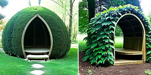 Техника заключается в том, что молодые гибкие побеги переплетают между собой, создавая своего рода «каркас», укрепляющий конструкцию беседки. Со временем переплетенные ветки срастаются между собой, формируя единое целое.