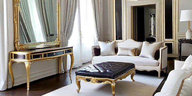 Золото является одним из ключевых элементов французского интерьера. Оно подчеркивает утонченность и богатство стиля. Использование золочёных рам, ножек мебели, ручек и элементов декора придаёт комнате изысканность и тепло.