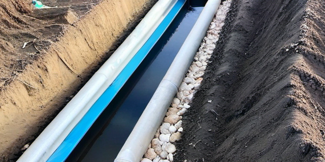 Подготовка включает разметку территории, рытьё траншей под трубы и установку колодцев.