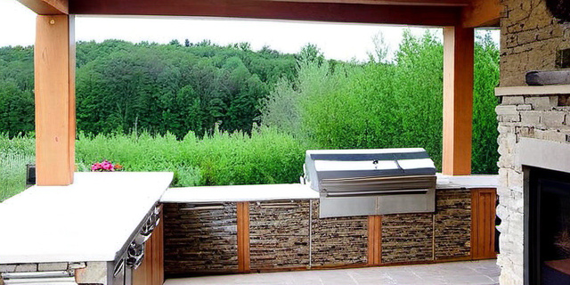 В Подмосковье было реализовано оформление летней кухни с обшивкой из термообработанной лиственницы и отделкой стены крупными плитами песчаника. За два сезона эксплуатации материал сохранил изначальный оттенок, а кухня стала любимым местом семьи для приема гостей.