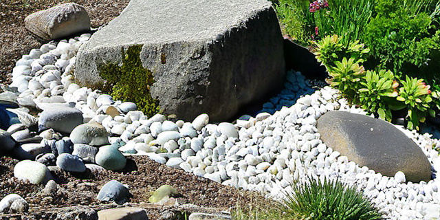 - Сформируйте композиции из камней разного размера — крупные валуны создают основу, мелкие камни и щебень заполняют пространство.